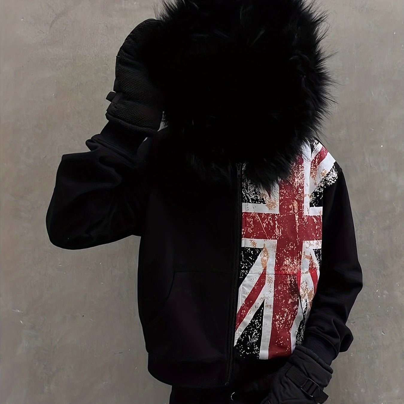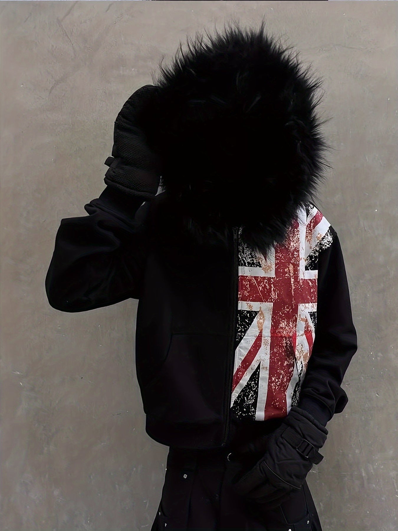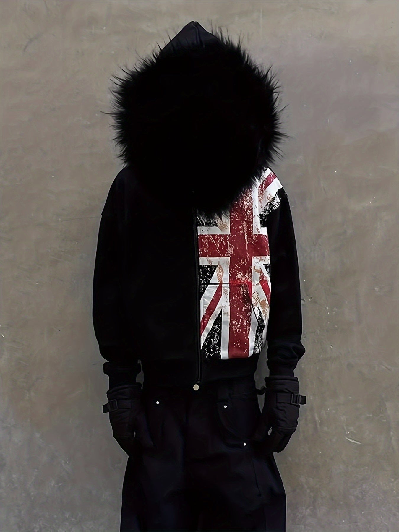 Ta bluza łączy klasyczną czerń z wyrazistym printem inspirowanym flagą w rockowym, postarzałym stylu. Futrzany kaptur dodaje jej luksusowego charakteru.